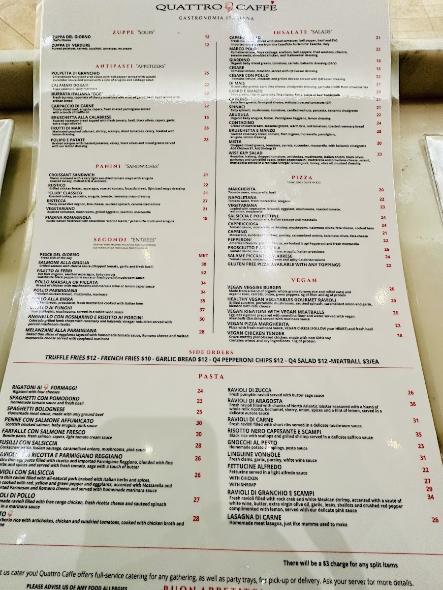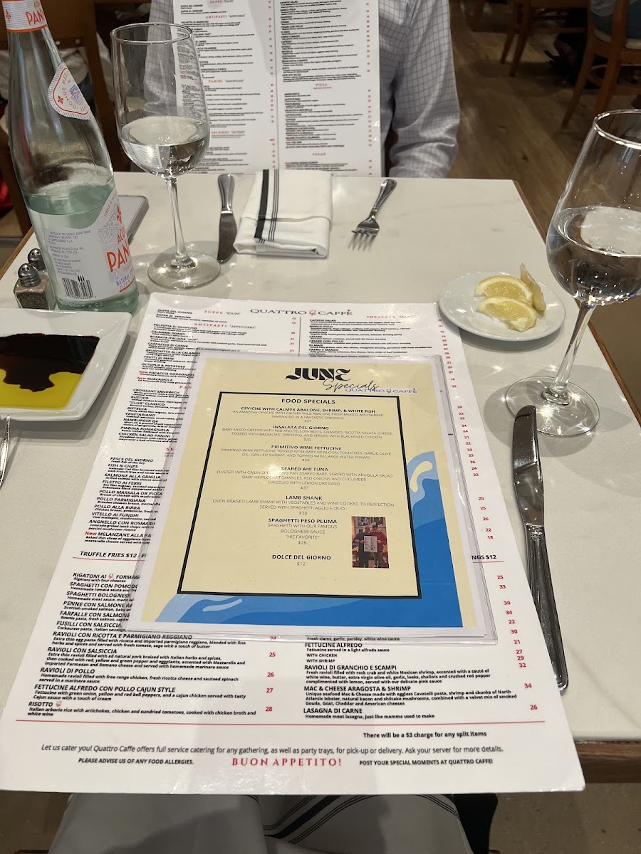 Qattro Cafe in Costa Mesa California located in South Coast Plaza is one of my favorite Italian places. Drinks were delicious. Miriam the head chef and her team never disappoints. Everything that comes out of the kitchen has a touch of love. Pascual our server provided great service.