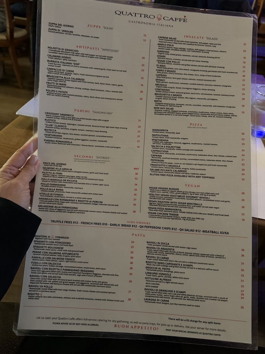 Quattro Caffé is celebrated for its extensive menu that caters to a variety of tastes, with outstanding options for seafood lovers and vegans alike. Guests rave about the fresh seafood dishes, like the tender calamari and the rich seafood pasta, both praised for their bold flavors and freshness. One visiting family described their meal as a communal celebration, sharing plates of calamari, the renowned "wise guy" salad, and a seasonal summer pasta that delighted their palates.